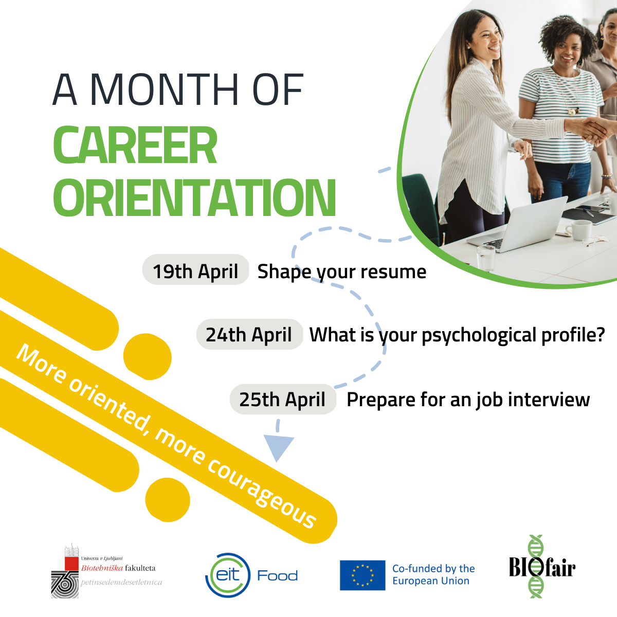 The Career Centre of the Biotechnical Faculty, Biofair association and the EIT Food Hub Slovenia are organising the "Month of cereer orientation for Students of the Biotechnical Faculty" under the slogan "More oriented, more courageous!". In three introductory interactive workshops, together with representatives of employers, career counsellors and other experts in the field, we will promote the skills needed by students of the Biotechnical Faculty that are needed on their way to a suitable job.